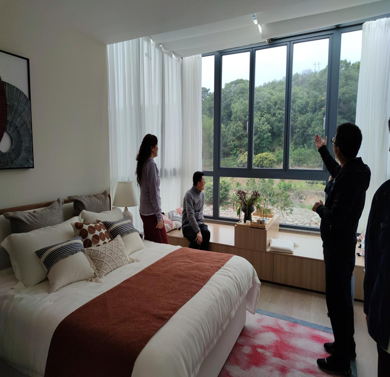 林主席一行饒有興致地參觀樣板房,并仔細了解房屋設計、布局等情況。