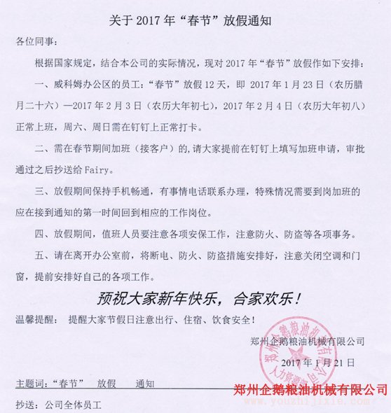 關(guān)于鄭州企鵝2017年春節(jié)放假通知
